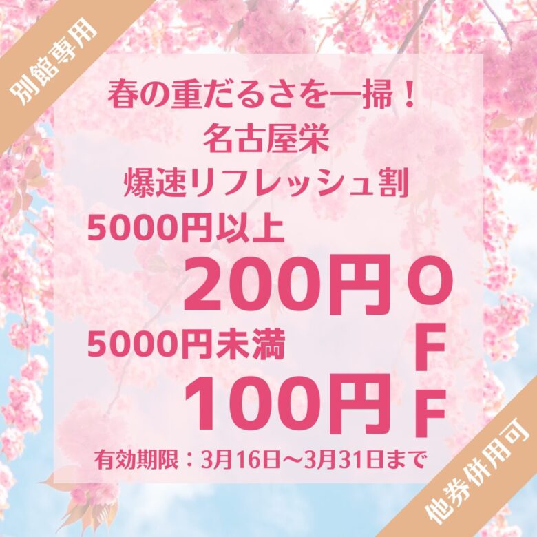 春の重だるさを一掃!名古屋栄・爆速リフレッシュ割|3/16〜3/31【マッサージ 名古屋栄・安い】